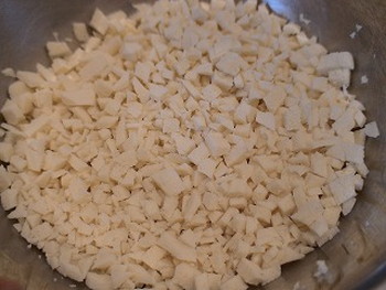●乾燥ひじき、高野豆腐は、水に戻しておく。高野豆腐はさらに水気をしぼり細かくみじん切りする(写真右)