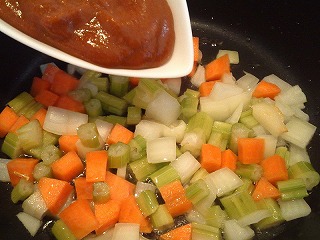 1.鍋にサラダ油(少々)をひき、潰したニンニク(1片)と一緒にタマネギ(1/8個)、ニンジン(1/6本)、セロリ(1/4本)をサイコロ状に切り、サッと中火で炒めます。