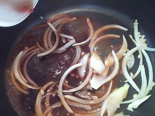 みじん切りのニンニク(1/2片)、赤ワイン(30ml)を加え、アルコールを飛ばします。