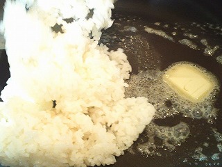 6.別のフライパンにバター(10g)を溶かし、ご飯(2人分)、塩・コショウ(各適量)、みじん切りのパセリ(ひとつまみ)を加えて中火で炒めます。