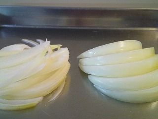 3.牛肉(120g、一口大)、タマネギは厚さを変えて切ります(1/8個⇒2mm幅、1/8個⇒5mm幅)。
