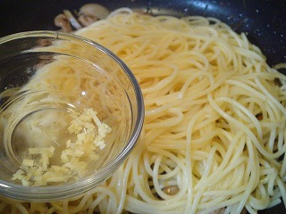 7.1の茹であがったパスタを加えて、ショウガ(残り半量)を加えてソースと絡めます。