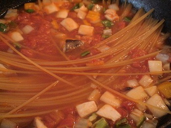 6.さらにパスタを加え、5分ほどかき混ぜながら煮る。