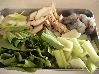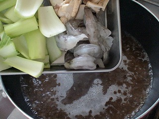 3.お湯(300ml)に鶏がらスープの素、みりん、しょうゆ、お好みでショウガのすりおろしを入れたら、エビ、チンゲン菜の茎、ネギ、シイタケを加える。