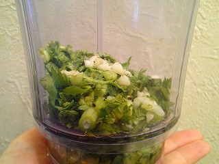 2.フードプロセッサーに1の春菊、松の実、粉チーズ、ニンニク、オリーブオイル、塩、コショウを入れて、1分ほど撹拌します。