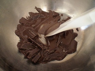 このとき、チョコレートがダマにならないように、生クリームは少しずつ加えます。