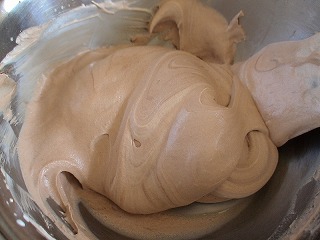 3.チョコレートクリームがゆるくなり、もうダマにならないようだったら、残りの生クリームをすべて加えます。普通のホイップクリームと同じように泡立て器でかき混ぜてホイップします。