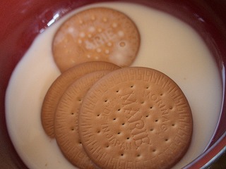 3.ビスケット(12枚)を軽く牛乳(約100cc)にくぐらせます。