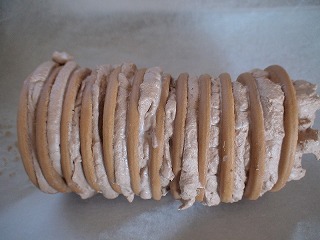 見て見て断面!ビスケットがうまいことクリームと交互に並んで、そこは上手いこと出来ました!