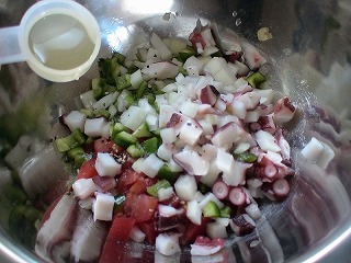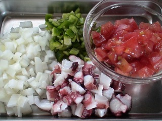 1.ゆでダコを1cm角に切ります。ピーマンはヘタ・種を取り除き、粗みじん切りします。