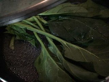 5.大きめのフライパンに水、塩、4のホウレンソウを入れて蓋をして1分ほど蒸し煮します。