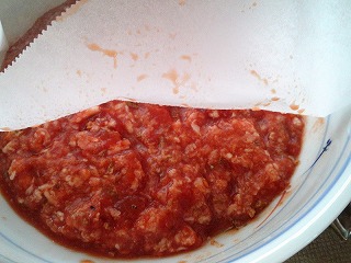 1.耐熱ボウルに豚ひき肉、フライドオニオン、トマト缶、ローリエ、塩、黒コショウを入れて混ぜ合わせたら、落としぶたをして電子レンジで5~6分(700W)加熱します。