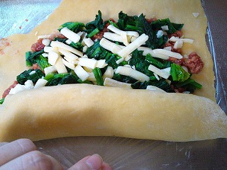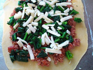 1のソース(半量)、2のホウレン草、ピザ用チーズの順に広げ散りばめます。