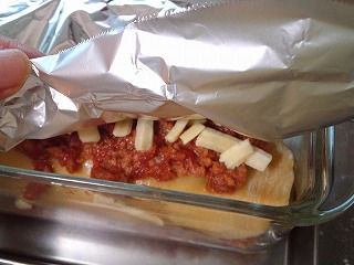 6.耐熱容器にオリーブ油を薄く塗り、ソース(残り半量)を底に広げて5のラザニア、ソース(残り全部)、ピザ用チーズの順にのせます。