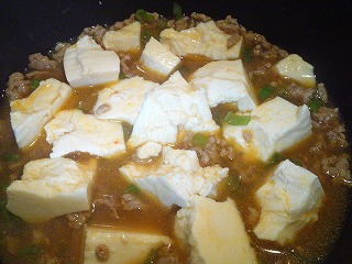 (私は、豆腐を木べらで適当な大きさに崩しました)
