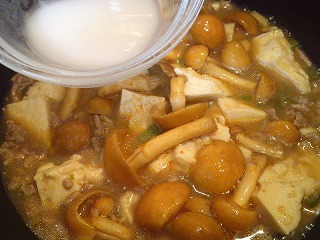 5.なめこを加え、火が通ったら水溶き片栗粉でとろみを付けます。