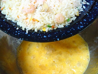 2.ボウルに卵を割り入れて、1のエビピラフを加えて混ぜ合わせます。