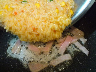 3.フライパンにバター、ベーコン(半量)を入れて、2(半量)を流し入れて、大きくかき混ぜながら半熟状になったら、フライパンの淵を使ってオムライスに成形し皿に盛ります。