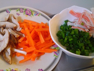 1.ニンジンは細切り、シイタケは石づきを除き薄切り、カニ風味かまぼこをほぐし、万能ネギは小口切りにします。