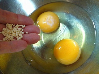 2.ボウルに卵を割り入れ、鶏ガラスープ(顆粒)、水を加えて溶きほぐしておきます。