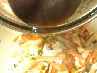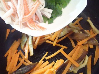 さらに、カニ風味かまぼこ、万能ネギを加えます。