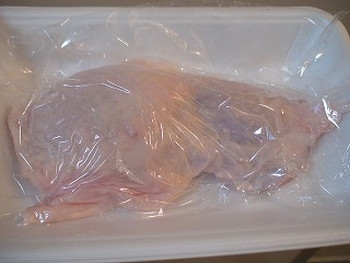 2.1の鶏もも肉に塩をまんべんなくまぶしたら、肉を覆うようにラップをして15分ほど置いておく。(右写真)