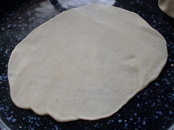 2.1の生地を手でよくこねて耳たぶくらいのかたさになったら、4等分し麺棒などで薄く大きく伸ばします。
