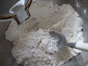 1.ボウルに薄力粉、オリーブオイル、塩を入れて軽くかき混ぜたら、少しずつお湯を加えてひとまとめにします。