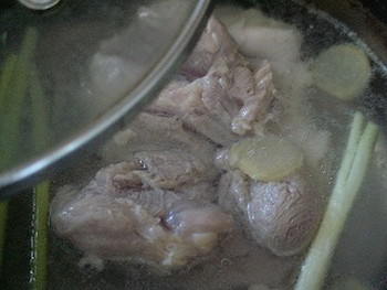 1.鍋に水、ニンニク、長ネギ、ショウガを入れて蓋をして沸騰させます。(小ねぎを代用してます)chickentaifu1