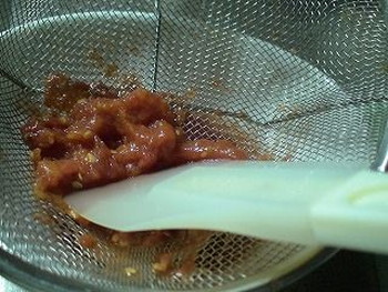 6.トマト缶をザルで漉しながら、滑らかになるようにゴムベラで押しつけながら裏ごしします(写真右)。