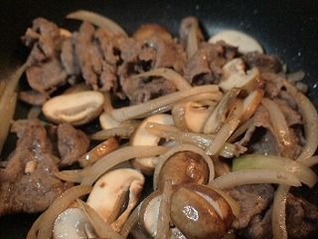 1.フライパンにサラダ油を熱し、牛肉を焼き色がつくまで炒めます。