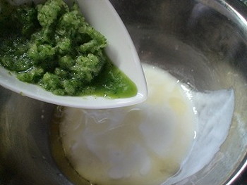 ボウルに合わせソースのヨーグルト、塩、ニンニク、オリーブ油、白ワインビネガーを入れて混ぜ合わせて、1のキュウリを汁ごと混ぜ合わせます(写真右)。