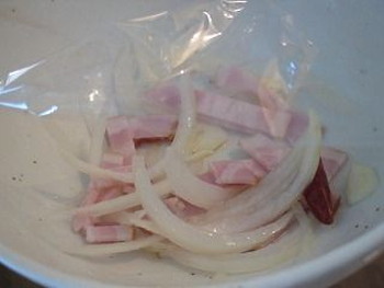 3.耐熱容器にAの材料を入れて、かるく混ぜ合わせたら、ラップをし電子レンジで5分ほど加熱します(700W)。