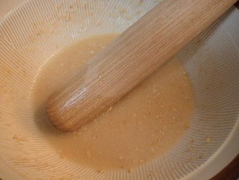 3.すり鉢で白ゴマを半ずりにする。味噌を加えてさらにすり混ぜたら、チキンスープを少しずつ加えながらのばす。(写真右)