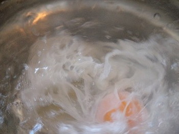 2.水(600cc)を沸騰直前まで温めて、酢と塩を入れ、箸でかき混ぜて鍋の中に渦を作る。その後すぐに、渦の真ん中のへこんだ部分に卵をそーっと落とす。