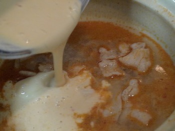 2.半分に切ったバラ肉を入れ、よく炒めたら酒を加えます。さらにお湯、鶏ガラスープの素を入れ煮立てていきます。kasunabe3