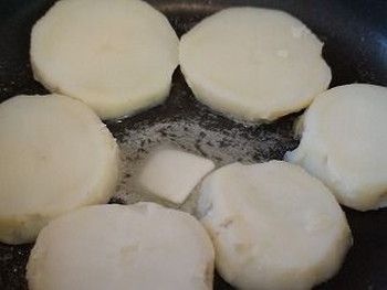 5.同じフライパンにバターを入れて中火で溶かし、2のジャガイモをなるべく重ならないように並べ入れます。