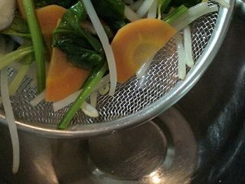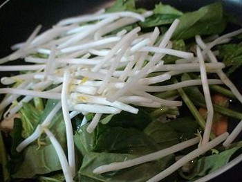 2.ふた付きの大きめのフライパンに水カップ1/2を注ぎ、にんじん、しめじ、ほうれんそう、もやしの順に重ねる。