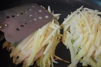 そう、ジャガイモがなんですがね・・・手持ちの道具では、思ったような千切りにならなくて、急きょ、包丁で千切りにしました。
