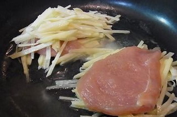 3.フライパンにバターを入れ、半分ほど溶けたらじゃがいもの半量を2か所に敷き、その上に鶏肉を並べる。