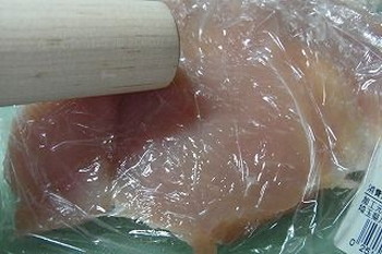 1.鶏肉は皮を除いて厚みを半分に開き、ラップをかけ、めん棒などでたたいて1.5倍にのばす。