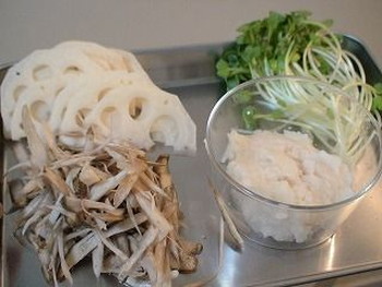 れんこんは洗って皮をむき、半分は厚さ2ミリ程度の薄切り(半月)にして、さっと水にくぐらせる。残り半分はすり下ろす。すり下ろしたれんこんはラップフィルムをかけ、なるべく空気にふれないようにしておく。