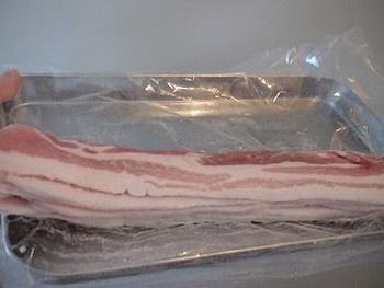 1.豚肉は、ラップの上に重ねて、3~4センチ高さに整える(放送:10枚くらいでした)。