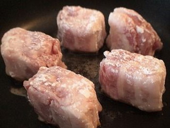 2.フライパンにサラダ油を熱し、1をばらばらにならないように表面をこんがりと焼く。いったん取り出します。