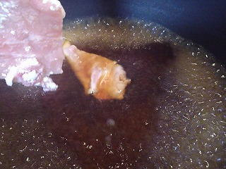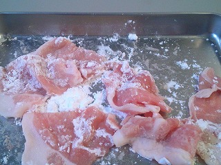 2.豚もも肉はひと口大に切り、かたくり粉をまぶします。
