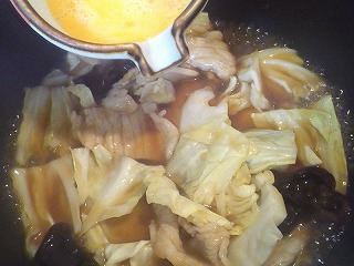 4.沸いたらキャベツ・きくらげを入れ、ひと煮立ちしたら溶き卵を入れます。