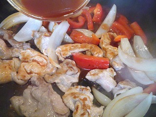 たまねぎ、パプリカをフライパンの端に寄せ、豚肉を加えて少し焦げ目がつくまで炒めます。
