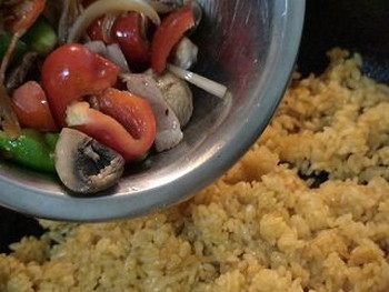 ●私は蒸らし終えたピラフをボウルに移さずに、そのまま炒めた具材と混ぜ合わせました(写真右)。