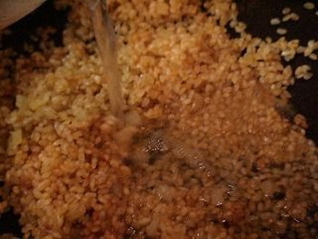 3.2の鍋に1の米を加えて炒め、米を手で触ってみて、熱く感じるまでよく炒める。