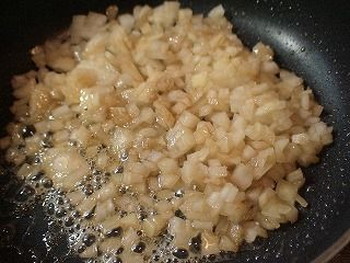 2.フライパンにバターを強火で茶色く色づくまで熱する。タマネギを加えて、サッと炒める。